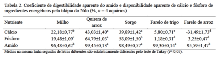 A quirera de arroz e o sorgo apresentam alta disponibilidade de Ca e P para a tilápia do Nilo e e esta espécie é capaz de utilizar eficientemente o amido presente nos ingredientes energéticos. Estudos são necessários para elucidar o efeito do processamento na disponibilidade de minerais dos ingredientes e, desta forma, reduzir sua excreção para o meio.