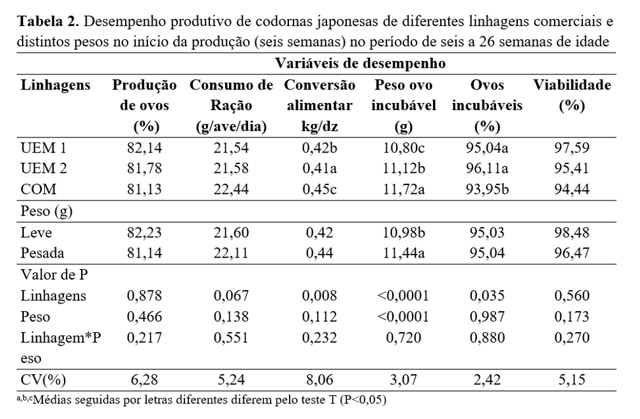 Na Tabela 2 estão apresentados os resultados de desempenho de codornas japonesas para o primeiro período estudado (seis a 26 semanas de idade). Não houve efeito de interação entre linhagem e peso inicial das aves para nenhuma das variáveis estudadas (P>0,05). Ainda, pode-se observar que não houve diferença (P>0,05) entre os grupos genéticos para produção de ovos, quando considerado o período de seis a 26 semanas de idade. Não houve efeito do peso corporal (P>0,05) sobre a produção de ovos durante o período de produção estudado.