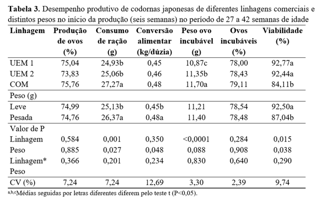 O desempenho das codornas japonesas avaliado na fase pós pico, de 27 até 42 semanas de idade das aves (Tabela 3), não houve interação entre os fatores para nenhuma das variáveis estudadas (P>0,05). Observou-se menor consumo de ração (P<0,05) para as linhagens melhoradas em comparação as aves sem melhoramento específico. Entretanto, não houve diferenças (P>0,05) entre as linhagens para produção de ovos, conversão alimentar e número de ovos incubáveis. Para o peso inicial das codornas, aves mais leves apresentaram menor consumo de ração e melhor conversão alimentar (P<0,05).