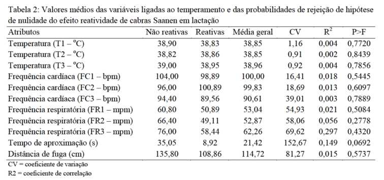 Causa estranheza o fato de a medida distância de fuga não ter sido afetada pela reatividade, pois é uma das medidas mais utilizadas na verificação da reatividade em diferentes espécies animais. É possível que o tipo de criação – manejo intensivo com contato diário e constante com pessoas – tenha feito com que as cabras se tornassem acostumadas à presença e aproximação de humanos. A capacidade de adaptação à presença de pessoas e ao contato frequente é determinada pelo aprendizado durante a vida do animal, tornando-se uma característica importante que facilita o manejo minimizando os efeitos negativos sobre seu bem-estar (PRICE, 2002)