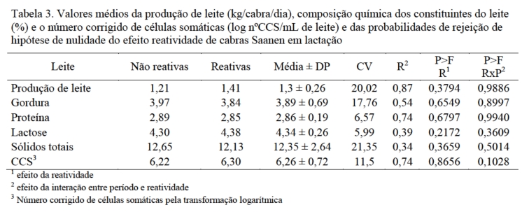 A composição do leite não foi afetada pela reatividade dos animais nem houve interação entre reatividade e período de medidas. Dessa forma os dados médios de produção e composição do leite conforme as classes de reatividade são apresentadas na Tabela 3.