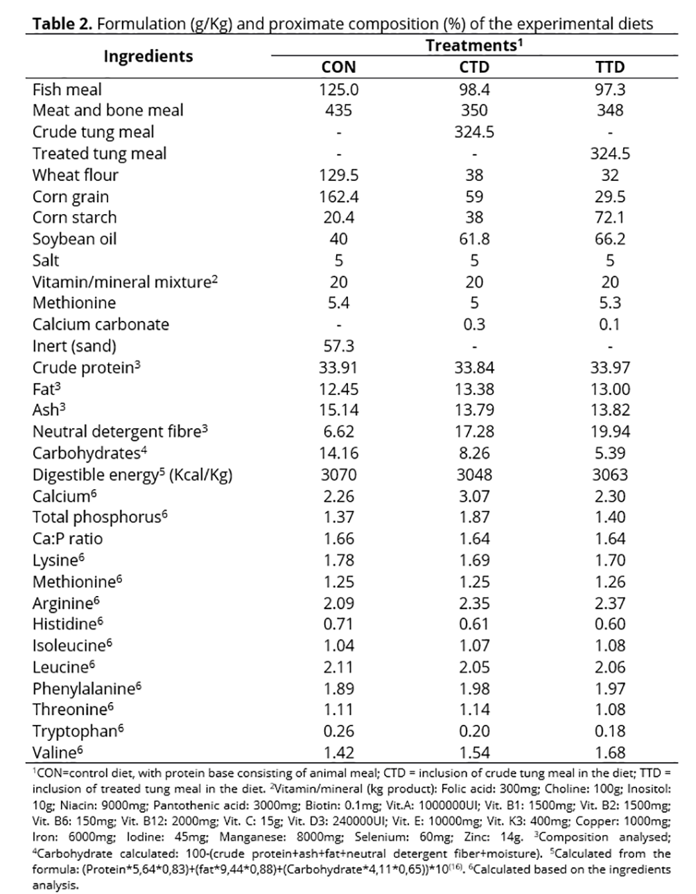 The tung meal was substituted for 20% of the animal protein (meat and bone meal and fish meal) in diets containing approximately 34% of crude protein and 3,100 Kcal/Kg of digestible energy based on the study of Pretto et al.(7) (Table 2). Where necessary, methionine and lysine were included in the diet in order to meet the nutritional requirement of the species(15). The diets were analysed for dry matter, ash, crude protein, fat and neutral detergent fibre according the methodologies mentioned above.