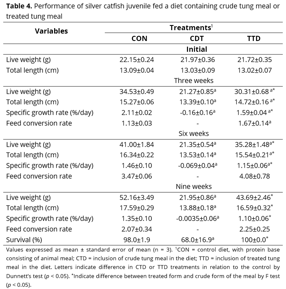 Another study investigated the inactivation of trypsin inhibitors and lectins and the removal of phorbol esters in Jatropha curcas, another species of the Euphorbiaceae family, to which tung belongs(35). In that study, the solvent and heat treatments were applied for shorter (30 minutes) or longer (60 minutes) periods. The meal detoxified for the shorter time (30 minutes) resulted in reduced weight gain, specific growth rate and body weight of animals. In addition, this meal had decreased digestibility of proteins and other nutrients. The poor performance was attributed to the incomplete detoxification of the meal. In contrast, the J. curcas meal detoxified for the longer time period (60 minutes) had a lower antinutrient concentration. When this was included in the feed provided to Cyprinus carpio (carp) fingerlings, it resulted in a growth response similar to that of the control diet, which contained fish and wheat meal as the protein sources. Similarly, in our study, the poor performance and increased mortality observed in fish fed the diet containing crude tung meal are most likely to be associated with the presence of anti-nutritional factors. These substances can be released in the fish intestines during digestion, resulting in an impaired growth response and pathological lesions in organs or mucous cells(36). The chemical treatment may have also removed other anti-nutritional factors in addition to phytic acid and condensed tannins, potentially even toxic substances, which may have contributed to the better performance of the animals that consumed treated tung meal. Similar to the results observed with silver catfish, treated tung meal also promoted greater growth of C. carpio juveniles compared to crude tung meal(7).