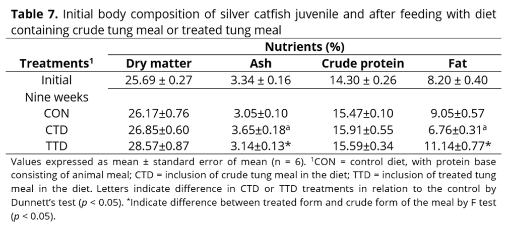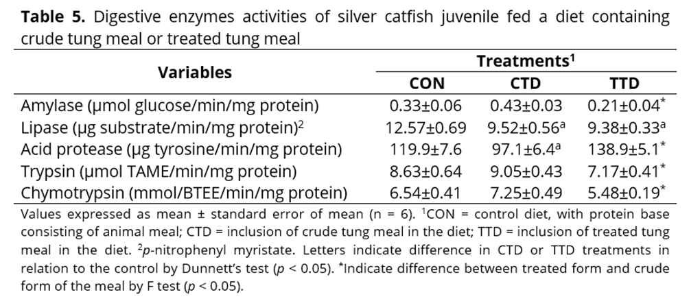 Thus, the aim of this study was to investigate the use of crude tung meal (without treatment) or chemically treated tung meal (reduced in antinutrients) as a partial substitute for animal protein in the diet of Rhamdia quelen (silver catfish) on growth, digestive enzyme activity and metabolic parameters in juveniles.