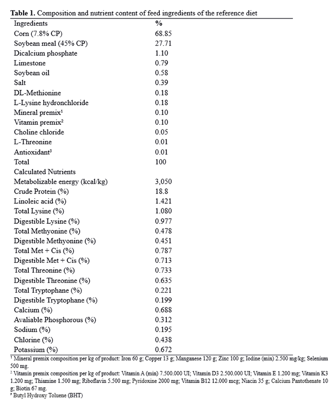 To perform energy value calculations, a group of broilers received a reference diet (Table 1) while the other three groups received different treatments comprising 60% of the reference diet and 40% of the ingredient to be evaluated, except for cottonseed meal, which replaced 20% of the reference diet owing to its high crude fiber content.