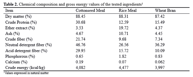 The ingredients evaluated were cottonseed meal, rice meal, and wheat bran. For chemical composition the following analyses were performed according to the Association of Official Analytical Chemistry(13): dry matter (DM), crude protein (CP), ether extract (EE), crude fiber (CF), and ash. Neutral detergent fiber (NDF) and acid detergent fiber (ADF) were determined according to Van Soest et al.(14); gross energy (GE) was determined using the IKA C 2000 calorimeter (IKA Brasil, Campinas, SP, Brazil); and Ca and P were determined according to the Adolfo Lutz Institute methodology(15).