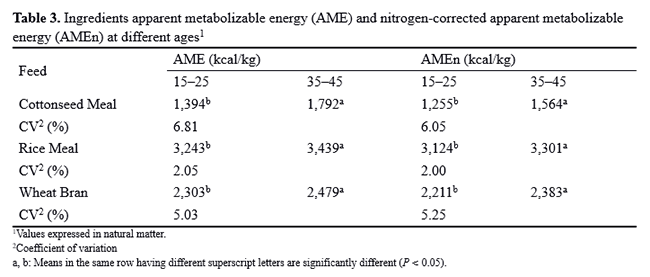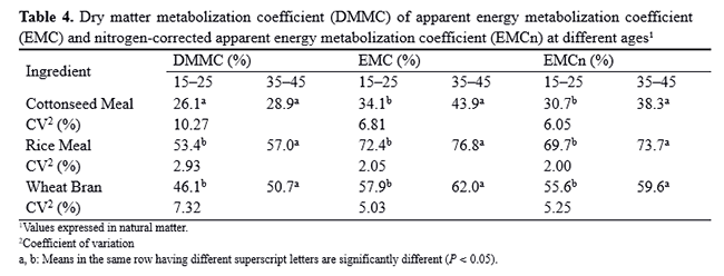 Rice meal and wheat bran showed higher value of DMMC at the second age evaluated (P < 0.05). In contrast, Pontalti et al.(31) mentioned lower values than in the previous study. Nonetheless, EMC in both studies were similar.