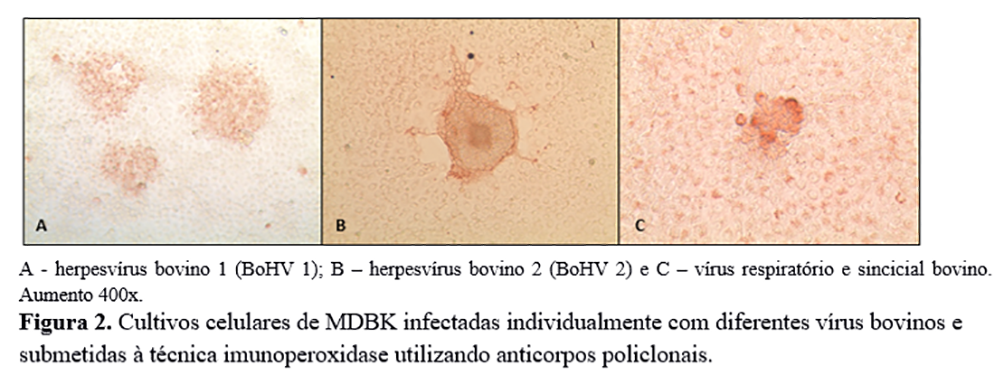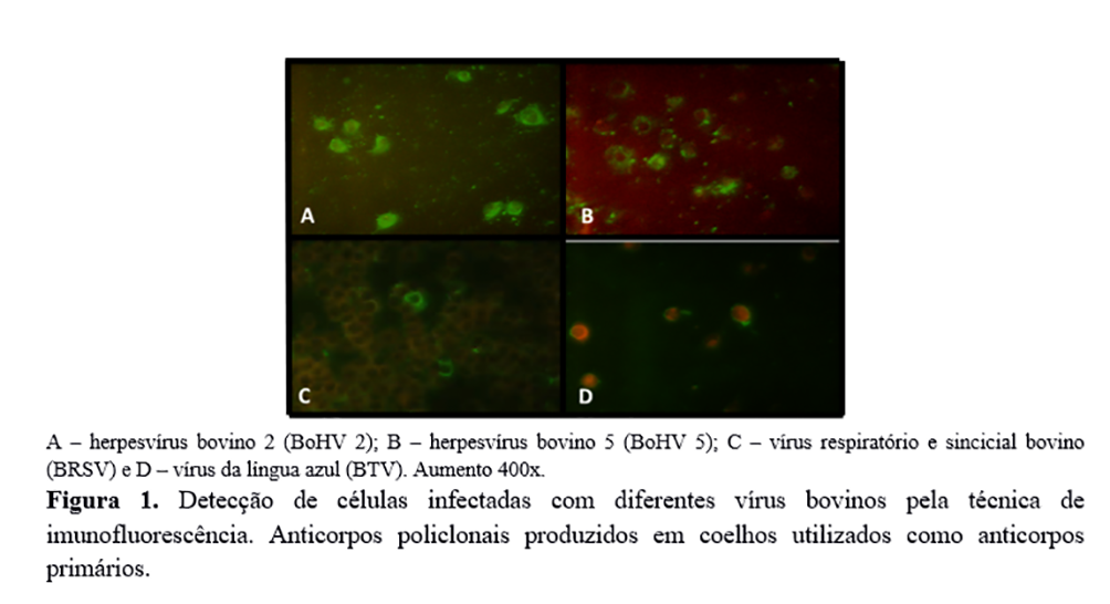 O rebanho bovino brasileiro é composto por mais de 200 milhões de animais e está susceptível a diversos agentes virais, entre os quais se destacam o herpesvírus bovino tipos 1 e 5 (BoHV 1 e 5), vírus da diarreia viral bovina (BVDV), vírus respiratório sincicial bovino (BRSV), vírus da língua azul (BTV) e vírus da vaccínia (VACV), entre outros(5, 6, 7, 8, 10). O diagnóstico laboratorial dessas enfermidades pode ser realizado pela detecção das partículas ou material genético viral. Diversas técnicas como imunofluorescência, imunoperoxidade e ELISA são empregadas como alternativas para a identificação e diagnóstico de partículas víricas(1, 3). Esses testes são rotineiramente utilizados em laboratórios de diagnóstico e pesquisa para identificar a presença de antígenos virais em amostras suspeitas(1, 3). Um limitante para a utilização dos imunoensaios para os laboratórios é a disponibilidade dos anticorpos ou antissoros(3). O objetivo deste trabalho foi produzir anticorpos policlonais para vírus bovinos e avaliar a sua reatividade em ensaios de imunofluorescência, imunoperoxidase e slot blot.