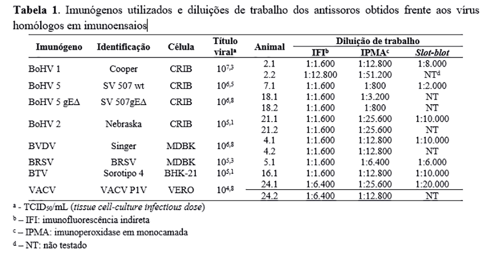 As imunizações dos animais produziram antissoros capazes de reagir especificamente com antígenos virais em três diferentes imunoensaios (Tabela 1). Geralmente, as diluições de trabalho para imunofluorescência foram inferiores às diluições de trabalho para a imunoperoxidase e slot blot (Tabela 1). Ainda, diluições inferiores a 1:800 produziram reações inespecíficas com células não infectadas. Durante os procedimentos de imunização, não foram observadas reações locais ou sistêmicas nos animais. Um animal (#7.2) imunizado com o vírus BoHV 5 (SV 507 wt) morreu no dia 50 dpv de causas não relacionadas com a imunização.
