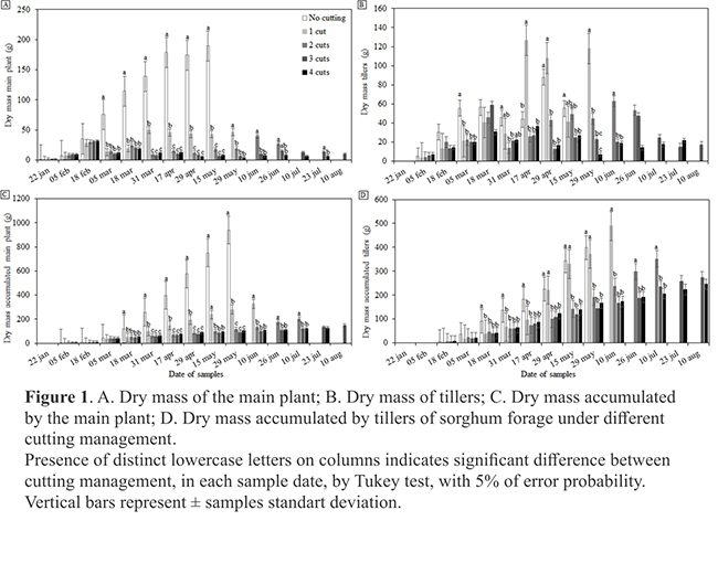 Therefore,for a sorghum forage crop,it is recommended to restrain the cutting management up to three times during the crop cycle,since it has the biomass potential production,and the cuts should be made at every 25 days,depending on the increase of dry mass.After that,the cut management should not be done,mainly due to the low radiation use efficiency,reduced dry mass accumulation,and low material quality.