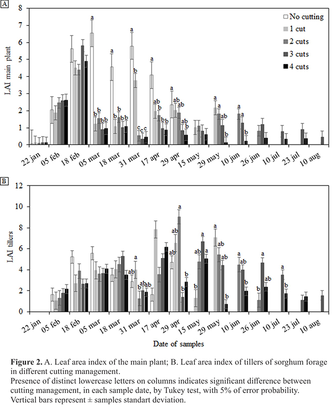 The answer of plants to management cutting depends of its regrowth capacity,amount of tissue removed,and photosynthetic capacity of the still existing tissue after the cut(17).The removal of plant's leaf area and stress by cuts difficults the plant recovery ability.Cutting reduces the leaf area index (LAI) of plants,especially of the main plants (Figure 2A).
