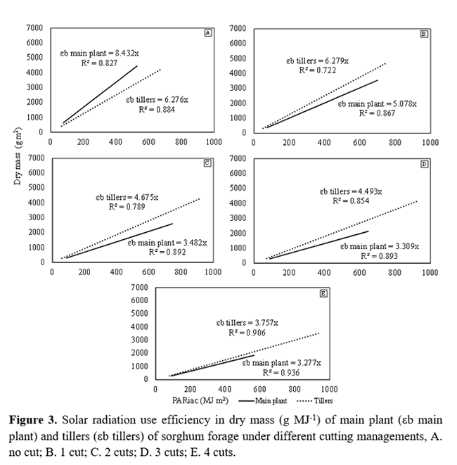 last one after 40 days of regrowth. The efficiency of the sorghum forage’s solar radiation use reduces as