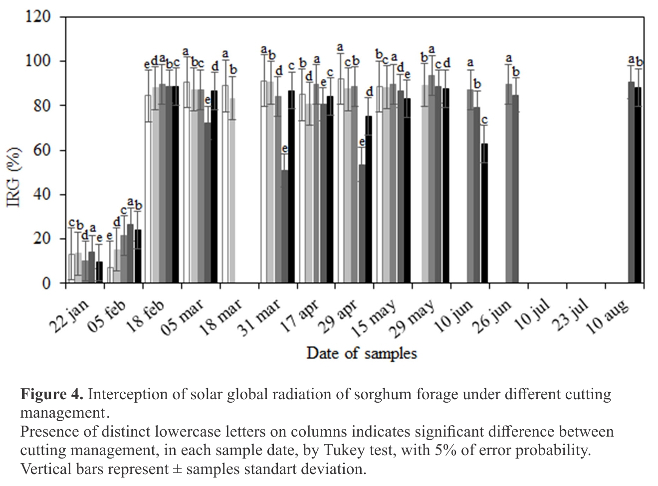 From the global incident radiation data (W m-2), measured in each sampling with a pyranometer (LICOR PY32164) coupled to the data logger (LICOR 1400), it was possible to calculate the global radiation interception (IRG)(14):