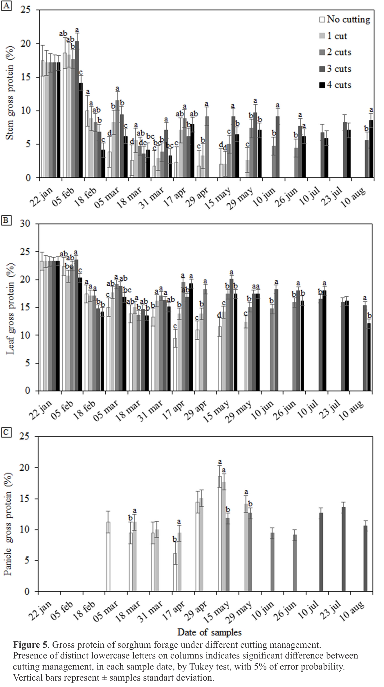 It can be noticed,especially in the plants without cutting,which developed its normal cycle,that as the crop cycle advances,the gross protein values decrease.This happens because the vegetative stage has a higher leaf proportion and younger tissue since gross protein values decreased in older tissues(32,33).