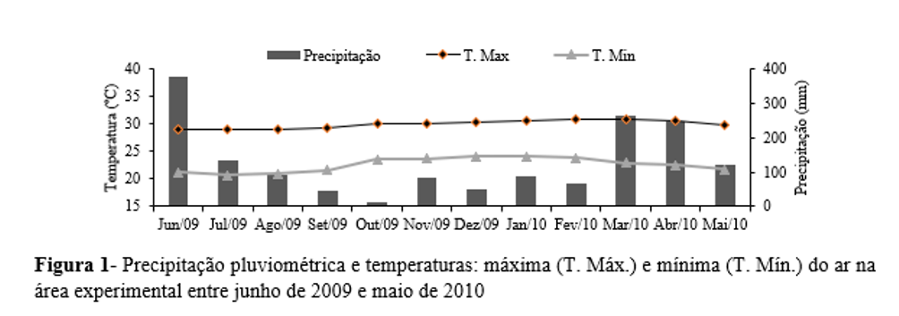 O clima da região, de acordo com a classificação climática de Thornthwaite(7), é subúmido seco, com excedente hídrico de maio a agosto. A precipitação média anual é de 1048 mm e evapotranspiração potencial média acumulada anual de 1472 mm. A precipitação e a temperatura ambiental na área foram monitoradas durante o período experimental (Figura 1).