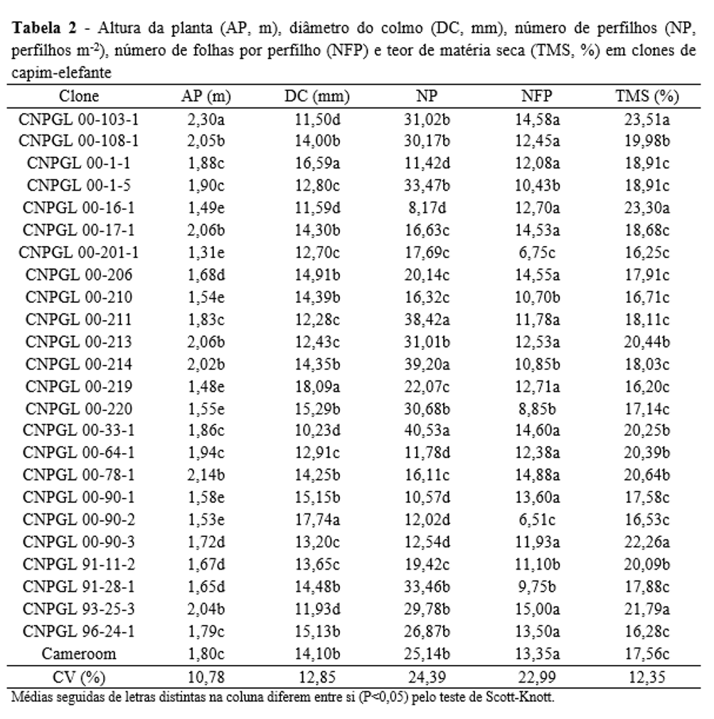 A altura das plantas (AP) foi agrupada em cinco grupos (P>0,05), o clone CNPGL 00-103-1 ficou sozinho no grupo de maior altura, mesmo no segundo grupo de maiores alturas todos os clones superam dois metros (Tabela 2). Para esses clones, podemos sugerir que um menor intervalo entre cortes pode contribuir para reduzir a quantidade de componentes estruturais, tornando-os mais nutritivos para os animais. Pois, quando manejados com cortes até 45 dias de idade, Bhering et al.(9) não observaram diferenças acentuadas na altura, diâmetro do colmo, percentagem de folhas e número de folhas do capim-elefante. O diâmetro do colmo diferiu em quatro grupos (P<0,05) (Tabela 2), onde apenas três clones ficaram no grupo com os maiores valores (CNPGL 00-219, CNPGL 00-90-2 e CNPGL 00-1-1) 1,2 ou 1,5 m.
