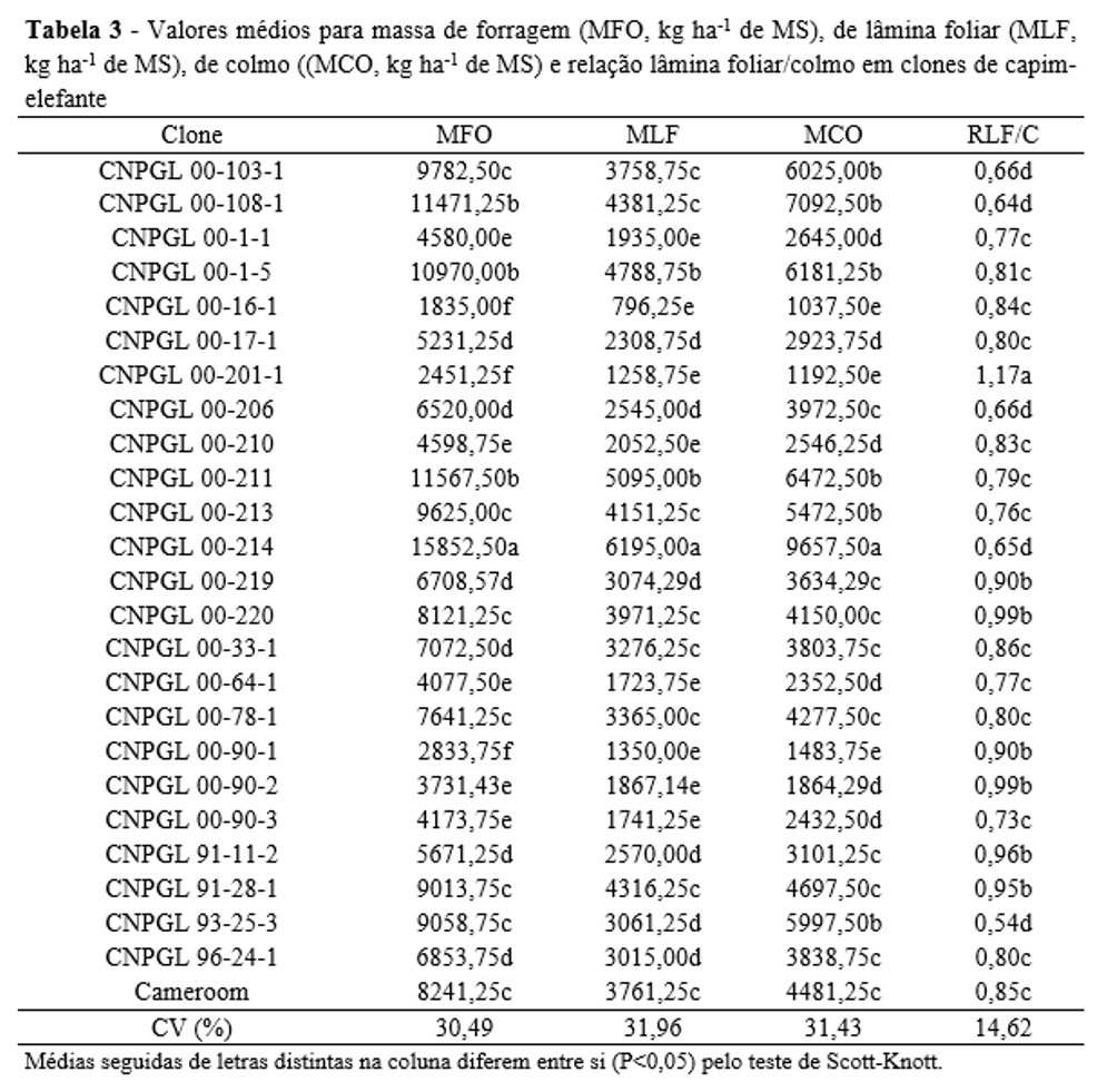 Assim como na MFO, as maiores (P<0,05) massas de lâmina foliar (MLF) e de colmo (MCO) foram observadas no clone CNPGL 00-214. Segundo Martuscello et al.(21), a alta e significativa correlação entre os componentes morfológicos do capim-elefante pode ser um indicativo de que o acúmulo de lâminas tende a aumentar a taxa fotossintética.