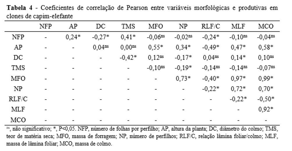 Embora muitos dos coeficientes das correlações avaliadas tenham sido significativos (P<0,05), poucos foram de média ou alta magnitude (Tabela 4). Isso pode ser atribuído à diversidade genética entre os clones, caso esta análise fosse realizada apenas com um clone, poderíamos obter maiores coeficientes de correlação. A MFO foi a variável com os maiores coeficientes de correlação com as demais, destacando-se sua alta e positiva correlação com o NP, a MLF e a MCO.