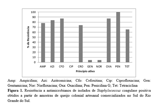 Foi possível observar que 65,00% dos isolados apresentaram resistência a seis ou mais antimicrobianos aumentando a preocupação quanto à dificuldade no tratamento em caso de infecções em humanos. Além disso, a alta resistência a Cefoxitina (86,95% dos isolados), usada atualmente como indicador de MRSA (Staphylococcus aureus Meticilina Resistente), torna esses resultados ainda mais preocupantes. Altos índices de resistência em isolados de Staphylococcus spp. têm sido relatados tanto em alimentos quanto em casos clínicos.