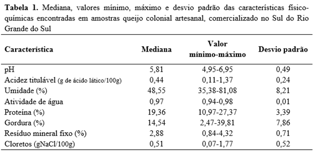 As características físico-químicas encontradas nas amostras do queijo evidenciaram grande variação, apresentando valores discrepantes quando comparados, sendo demostrada a completa ausência de padronização do queijo de produção artesanal comercializado na região sul do Rio Grande do Sul. Por este motivo, para representar cada parâmetro analisado, utilizou-se a mediana e não a média (Tabela 1).