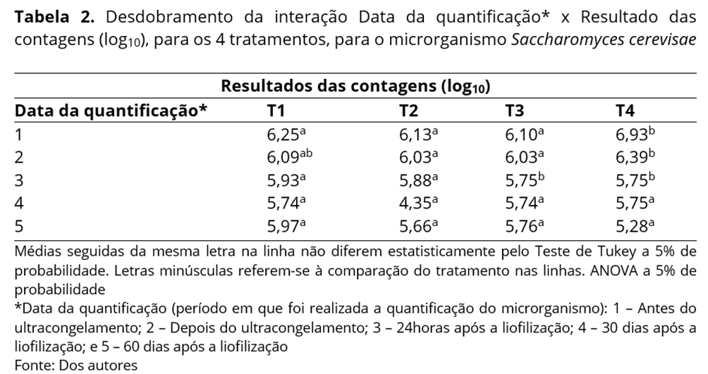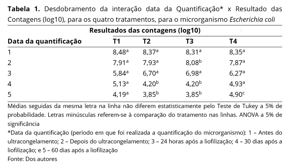 A Tabela 2 demostra que, nas duas primeiras quantificações (antes e depois do ultracongelamento), T1, T2 e T3 são estatisticamente iguais, com a contagem em T4 sendo um pouco maior. Após o ultracongelamento (Data de quantificação 2), T4 mantém-se pouco mais elevado, provavelmente devido à contagem inicial deste tratamento também ter sido maior.