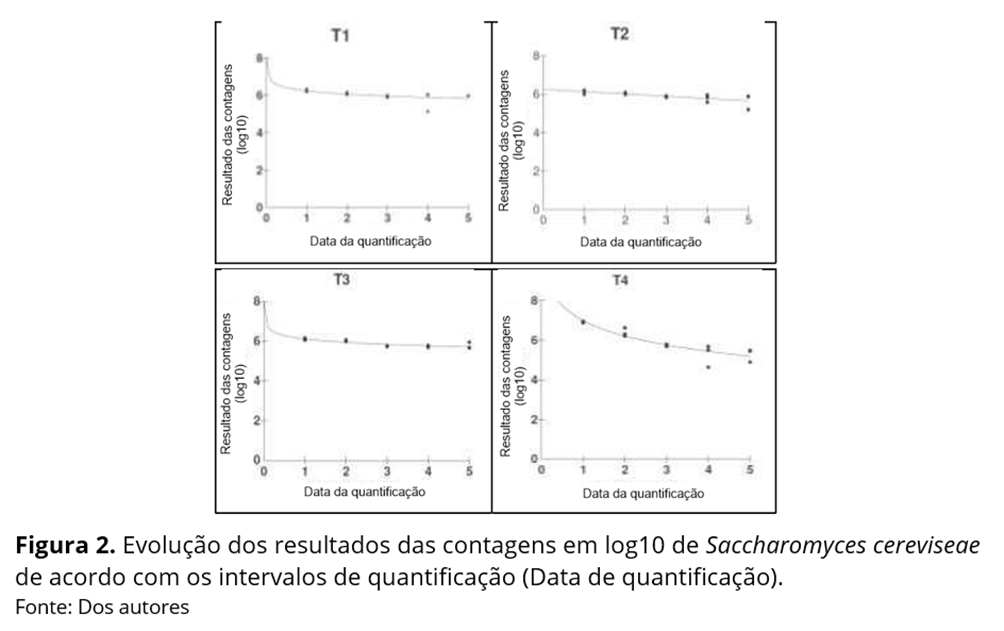 Mesmo com a constatação de que, quando houve diferença entre os tratamentos, esta foi pequena, pode-se observar que a perda de viabilidade do S. cerevisiae foi menor do que da E. coli, sendo de apenas 2 logs. A Figura 2 evidencia a evolução da recuperação do S. cerevisiae em relação aos períodos de quantificação.