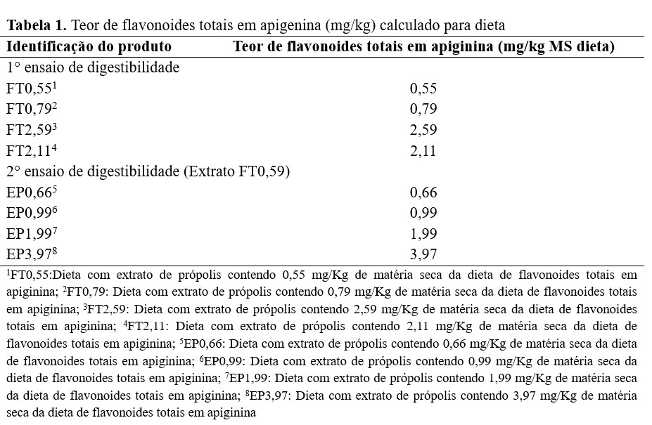 Com base no resultado do primeiro ensaio de digestibilidade, em função dos resultados e da facilidade de manuseio do produto, foi realizado o segundo ensaio de digestibilidade, utilizando apenas o extrato FT0,59, adicionado à dieta nos níveis de 0,267 (EP0,66), 0,533 (EP0,99), 0,800(EP1,99) e 1,067 mL/kg de ração (EP3,97), diluídos em óleo de soja, além da dieta controle (DC, sem inclusão de extrato de própolis, apenas do óleo de soja). Na Tabela 1, observam-se os teores de flavonoides totais em apigenina (mg/kg dieta).