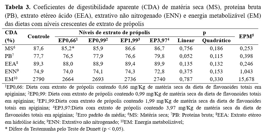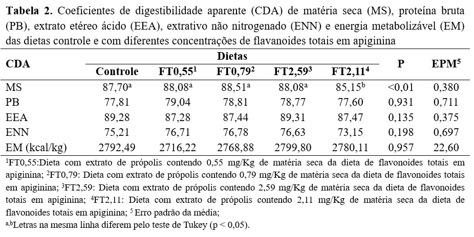 Com base nos resultados de digestibilidade da dieta e de facilidade de manuseio do produto observados no experimento anterior, o extrato FT0,59 foi escolhido para ser testado no segundo ensaio de digestibilidade. No segundo experimento de digestibilidade, não foram observadas diferenças entre as dietas conforme aumentaram os níveis de flavonoides totais, contabilizados pelo teor de apiginina (Tabela 3). Aplicando o teste de Dunett, apenas o CDA da MS da dieta EP0,66 foi menor (p < 0,05) em relação aos obtidos com a DC, sem adição do extrato de própolis FT0,59.