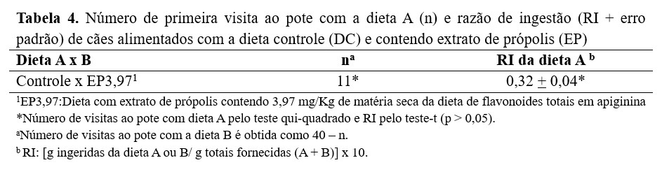 No ensaio de palatabilidade, foram observados maior razão de ingestão e maior número de visitas (p<0,05) da dieta contendo extrato de própolis (EP3,97), conforme Tabela 4.