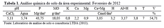 Antes de iniciada a implantação do pasto, realizou-se uma amostragem de solo para análise química do solo da área experimental (Tabela 1). Para a descrição das condições ambientais do período experimental, foram registradas mensalmente as médias de temperatura máxima, temperatura mínima, umidade relativa do ar e índice pluviométrico (Figura 1).