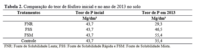 Comparando as fontes de fósforo de diferentes solubilidades, verificou-se resultados benéficos dos tratamentos com P prontamente disponível, FSM e FSS. O pH do solo, possivelmente, afetou esses resultados. Solos com pH entre 5 e 7 melhoram a eficiência de resposta dos fosfatos solúveis em virtude da menor adsorção de P pelos óxidos de Fe e Al(14).