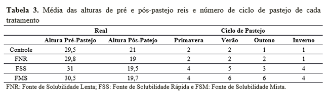 Os animais foram rotacionados nos piquetes por bloco, com altura média de entrada de 35 cm e altura de saída de 20 cm em média. As medições de altura foram realizadas duas vezes por semana, às segundas e sextas-feiras (Tabela 3).