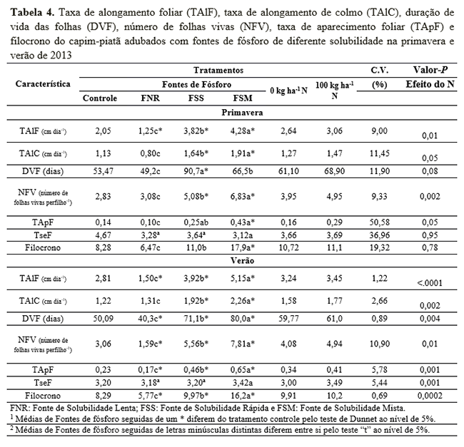 Existe uma correlação positiva entre as características estruturais e morfogênicas. A adubação com fonte mista de P (Tabela 4) incrementou a TApF, o que resultou em um maior incremento no aparecimento de perfilhos. Isso se deve ao fato de que, com o aparecimento de uma nova folha no perfilho, ocorre paralelamente o aparecimento de nova gema axilar, podendo gerar um novo perfilho. As condições climáticas durante o período experimental também estimularam o aparecimento de folhas e gemas axilares e, consequentemente, novos perfilhos.