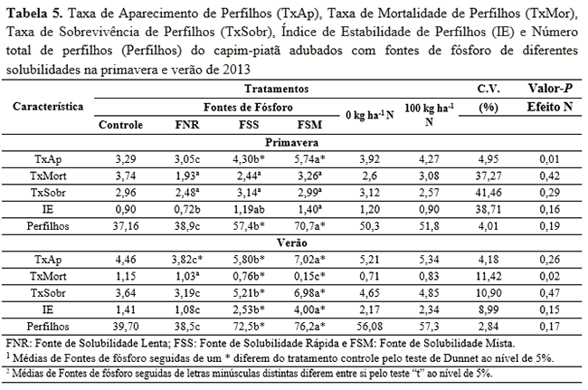Observou-se efeito (P<0,05) da adubação nitrogenada na TxAp (Tabela 5), com aumento de 8,9% no aparecimento de novos perfilhos nas plantas adubadas com nitrogênio. Nelson e Zarrough(24) relataram o aumento no perfilhamento de plantas forrageiras decorrentes da alta disponibilidade de N. Os autores evidenciaram ainda a importância dessa prática no acúmulo de massa seca e persistência da pastagem. Observaram-se diferenças entre as fontes de P na dinâmica de perfilhamento do capim-piatã. Tal fato pode ser explicado devido à baixa eficiência agronômica dos fosfatos de rocha. A baixa disponibilidade de P diminui a emissão de folhas nos perfilhos, prejudicando o perfilhamento das plantas forrageiras(25).