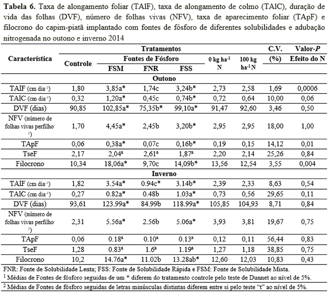 Ao contrastar os tratamentos com fontes de fósforo de diferentes solubilidades notou-se proeminência do tratamento com solubilidade mista (FSM) na TAlF, TAlC, TApF e filocrono no outono. No inverno, o tratamento FSM obteve superioridade apenas na TAlF. Apesar disso, o tratamento com fonte solúvel (FSS), juntamente com o tratamento FSM, se mostrou eficaz em relação ao controle e a fonte de baixa solubilidade em ambas as estações.