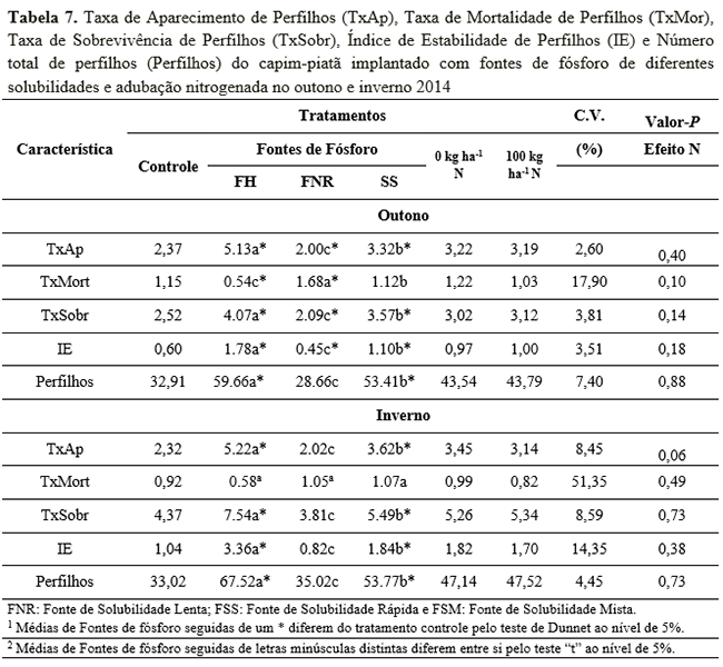 Não houve efeito (P>0,05) da adubação nitrogenada na dinâmica de perfilhos do capim-piatã no outono e inverno (Tabela 7). A fonte de solubilidade mista favoreceu o aparecimento, sobrevivência e o índice de estabilidade de perfilhos do capim-piatã nas duas estações estudadas. Entretanto, a fonte de baixa solubilidade elevou a taxa de mortalidade dos perfilhos, evidenciando-se ainda mais a importância do fósforo para a manutenção e estabilidade da pastagem.