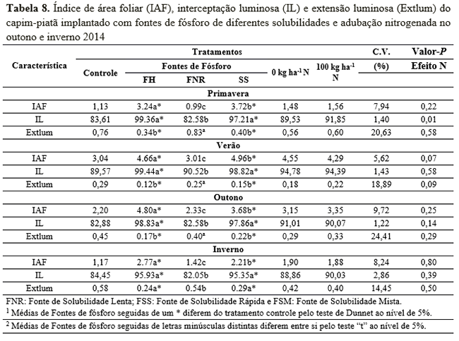 Houve efeito da adubação nitrogenada no capim-piatã apenas na primavera e na variável interceptação luminosa. Porém, não houve efeito (P>0,05) da adubação nitrogenada no índice de área foliar, interceptação luminosa e extensão luminosa do capim-piatã durante o verão, outono e inverno (Tabela 8).