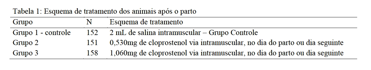 G1(n=144), grupo controle; G2 (n=145), 0.530mg de D+L-Cloprostenol, aplicados