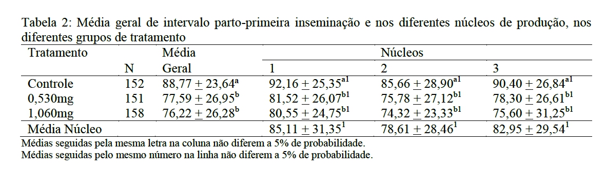 2. The following parameters evaluated were: services per conception (c2), days from parturition to first estrus, and open days (Tukey test).