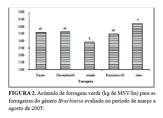 maior acúmulo de forragem foi do capim-mulato (4,2 t/ha de MS), seguido