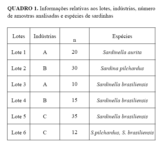 cinco lotes com exemplares de sardinhas provenientes da Venezuela (Sardinella aurita), Marrocos (S. pilchardus) e do Brasil (S. brasiliensis).