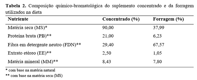 Considerando-se a categoria animal e peso vivo médio dos animais, estimou-se o consumo de matéria seca (CMS) em 11,55kg de MS/dia(12). Foram coletadas amostras de pasto e do suplemento para posterior análise no Laboratório de Nutrição Animal da Faculdade de Agronomia e Zootecnia da Universidade Federal de Mato Grosso (FAAZ − UFMT). Dessa forma, realizou-se pré-secagem das amostras em estufa ventilada por 72 horas e, ato contínuo, estas foram processadas em moinho com peneira de malha de 1,0 mm e acondicionadas em potes de plástico. Foram determinados os teores de matéria seca (MS), proteína bruta (PB), fibra em detergente neutro (FDN), extrato etéreo (EE) e matéria mineral (MM). Exceto pela análise de FDN(13), as demais análises seguiram as recomendações de Silva e Queiroz(14) (Tabela 2).