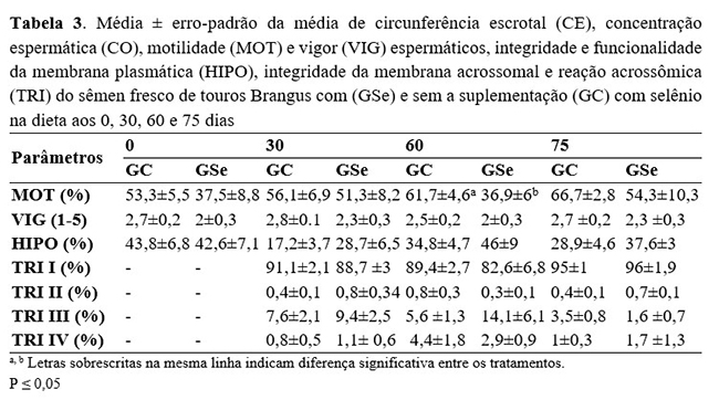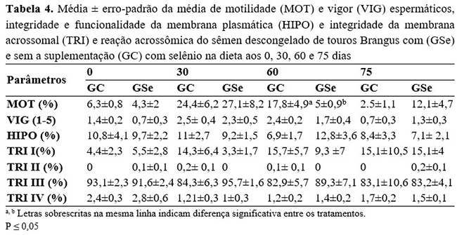 Ainda, ao longo do período experimental, não foi observada interferência da suplementação com selênio na dieta nos valores de vigor espermático, integridade e funcionalidade da membrana plasmática (HIPO) e integridade da membrana acrossomal e reação acrossomal (TRI) do sêmen fresco e descongelado. Em contrapartida, ao avaliar a motilidade espermática, foi constatado aumento gradativo nos valores dessa variável tanto no grupo controle como no grupo suplementado com selênio. Porém, após 60 dias de suplementação, o grupo suplementado apresentou queda nos valores de motilidade comparativamente ao grupo controle (P=0,0035) e, após o fim da suplementação com selênio na dieta, a porcentagem de espermatozoides móveis voltou a aumentar (Tabela 3). Comportamento semelhante foi constatado em amostras criopreservadas obtidas da terceira coleta (P=0,0067) (Tabela 4), na qual a motilidade espermática observada no grupo suplementado com selênio foi inferior ao grupo não suplementado.