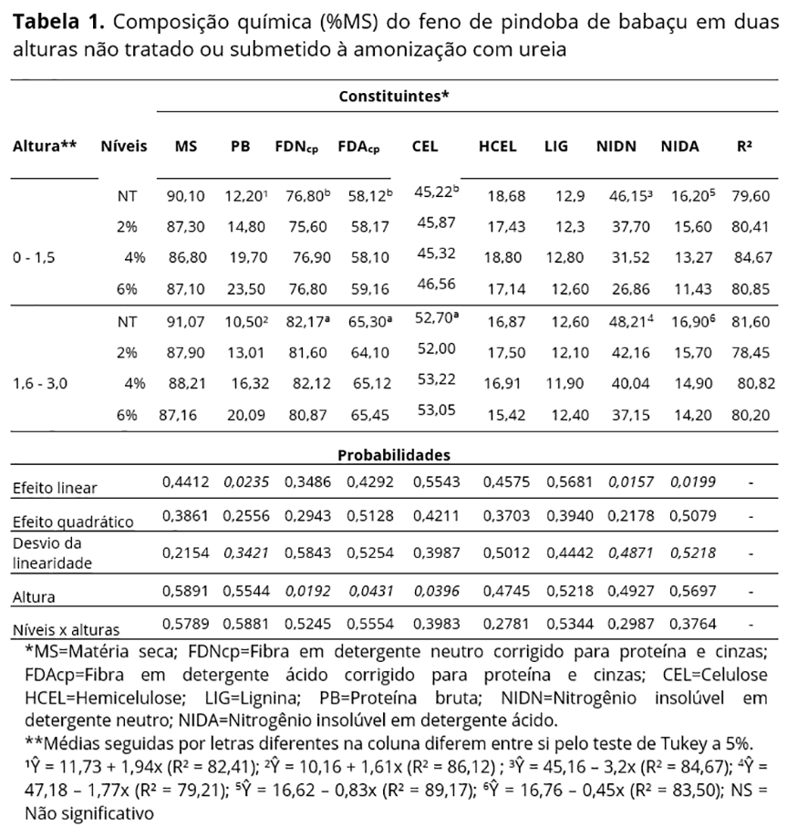 A amonização com ureia não influenciou os teores de FDNcp e FDAcp do feno de pindoba de babaçu, sem efeito linear ou desvio na linearidade, todavia houve aumento (P<0,05) dessas frações na maior altura da forrageira (1,6 – 3,0 m), com elevação de 4,07% para FDNcp e 7,33% para FDAcp no feno não tratado. Esses teores estão acima dos obtidos por Garcez et al.(4) ao avaliarem o feno dos folíolos de pindoba de babaçu, com médias de 67,6% e 49,6% para FDN e FDA, respectivamente, o que está associado às partes da planta utilizada; nesta pesquisa avaliou-se a folha completa, o que elevou os teores de constituintes fibrosos por incorporação oriunda do colmo central.