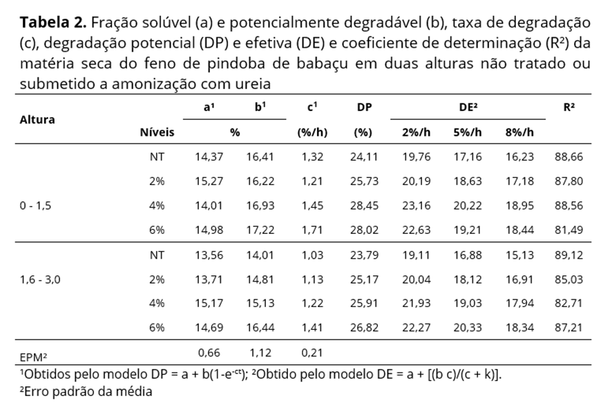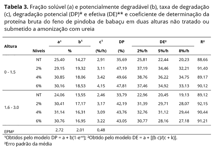 A fração solúvel (a) da PB foi elevada conforme o aumento das doses de ureia, relacionado à maior solubilidade desse composto nitrogenado (Tabela 3). A DP apresentou maiores valores no tratamento com 4% de ureia em ambas as alturas, com incrementos acima de 10%, porém inferiores aos obtidos por Moreira Filho et al.(6) para feno do restolho da cultura do milho amonizado com 3% de ureia.