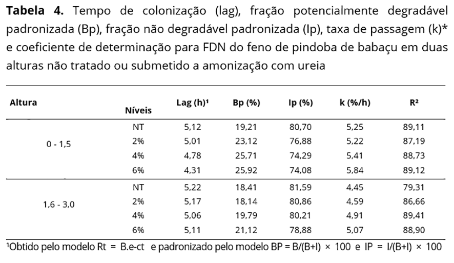 A fração indegradável da FDN (Ip) correspondeu à maior parte da fração fibrosa, o que pode ser o principal determinante da baixa degradação da MS, em virtude de a FDN corresponder a mais que 70% desse constituinte. O aumento dessa fração com o decorrer da idade da forrageira é esperado, uma vez que espécies de regiões semiáridas atingem maturidade fenológica precoce com aumento de estruturas de sustentação representadas pelos carboidratos fibrosos e lignina(26), sendo superiores aos obtidos por Garcez et al.(4) com 71,70% para feno de folíolos de pindoba de babaçu amonizado com 6% de ureia, associado à inclusão do colmo central mais fibroso quando do preparo do feno nesta pesquisa.