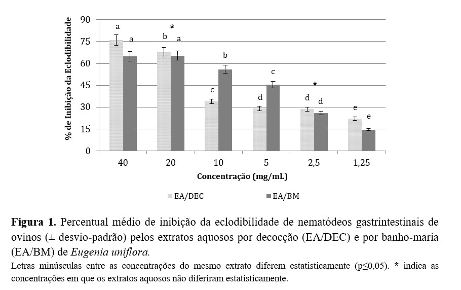 Estudos avaliando o potencial antiparasitário de plantas do gênero Eugenia, como extrato aquoso de E. aquea, demonstraram ação de 65,12% na inibição da eclodibilidade dos ovos de H. contortus(35), resultados semelhantes aos obtidos com os extratos aquosos do presente estudo, na concentração de 20 mg/mL. Em teste in vivo, Gaspar et al.(36) observaram a redução de 81% na contagem de ovos por grama de fezes após 14 dias da administração junto à ração de folhas secas de E. dysenteriae e Caryocar brasiliense, na proporção de 1,2 g/Kg, em ovinos parasitados por H. contortus.