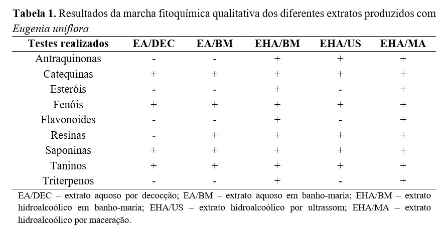 Os resultados da marcha fitoquímica qualitativa estão descritos na Tabela 1, sendo que foram semelhantes aos observados em estudo desenvolvido com óleo essencial de E. uniflora(21). Verificando a composição fitoquímica dos extratos, observou-se diferença entre a composição dos extratos aquosos em relação aos extratos hidroalcoólicos, sendo que os extrato EHA/BM e EHA/MA demonstraram maior quantidade de compostos, com relação aos demais pesquisados.