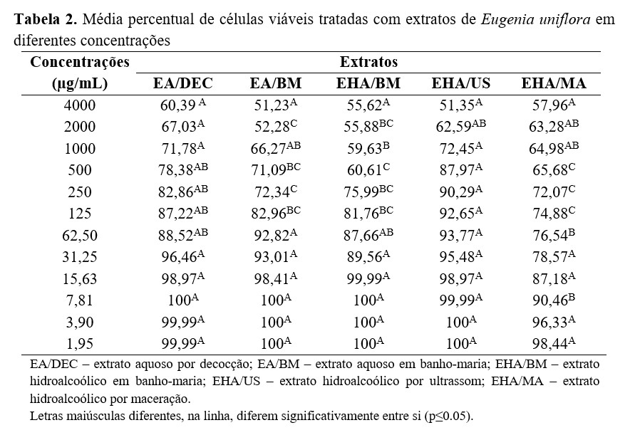 No teste de citotoxicidade, os resultados revelaram ação tóxica de moderada a nula dos extratos aquosos e hidroalcoólicos de E. uniflora nas concentrações testadas. Pesquisas avaliando a toxicidade celular in vitro de E. uniflora são escassas, no entanto, Santos et al.(22) , ao avaliarem a citotoxicidade de extrato etanólico de E. uniflora em macrófagos, observaram baixo efeito citotóxico na concentração de 100 µg/mL. Outro estudo analisou a citotoxicidade dos frutos da planta Eugenia dysenterica na forma de extrato etanólico e verificou ausência de efeito citotóxico até a concentração de 300 µg/mL(23). O presente estudo apresentou citotoxicidade semelhante aos trabalhos citados anteriormente, visto que na concentração de 250 µg/mL todos os extratos apresentaram o percentual de células viáveis, variando de 72,07 a 90,29%.