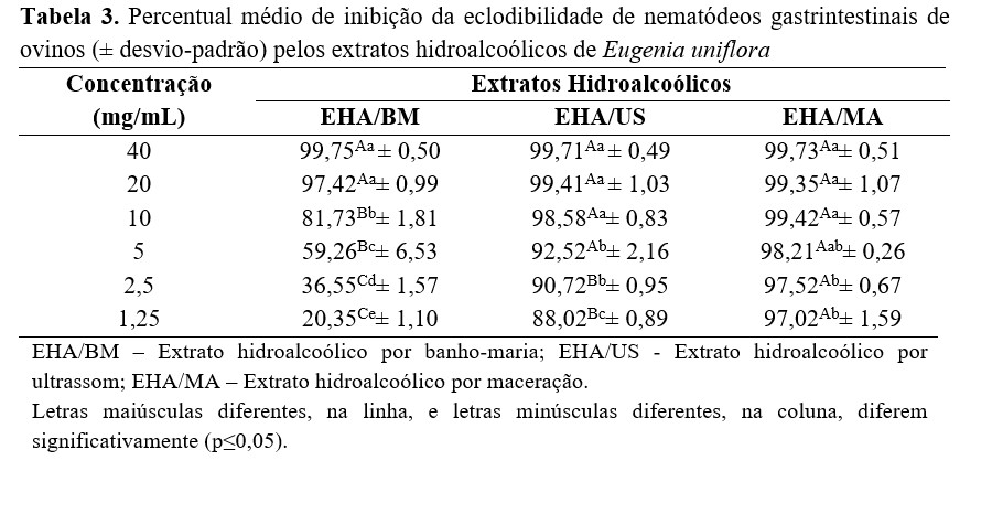 O percentual médio de inibição do extrato hidroalcoólico por banho-maria (EHA/BM), na concentração de 20 e 40 mg/mL, foi 97,42 e 99,75%, respectivamente, não diferindo estatisticamente entre si e do controle com anti-helmíntico (p˃0,05). A partir dessas concentrações, a atividade anti-helmíntica apresentou um decréscimo gradual até atingir 20,35% de inibição na concentração de 1,25 mg/mL. Os resultados do extrato hidroalcoólico por ultrassom (EHA/US) demonstraram inibição da eclodibilidade superior a 88% em todas as concentrações testadas. A ação permaneceu acima de 98% nas concentrações de 10, 20 e 40 mg/mL, as quais não diferiram estatisticamente entre si e nem do controle com anti-helmíntico (p˃0,05). Resultado semelhante foi observado no extrato hidroalcoólico por maceração (EHA/MA), que apresentou atividade de 97,02 a 99,73%, sendo que todas as concentrações testadas não apresentaram diferença estatística do controle com anti-helmíntico (p˃0,05).